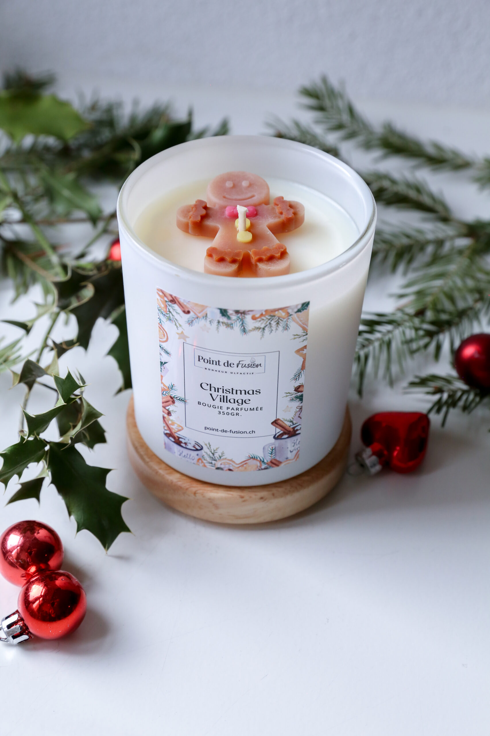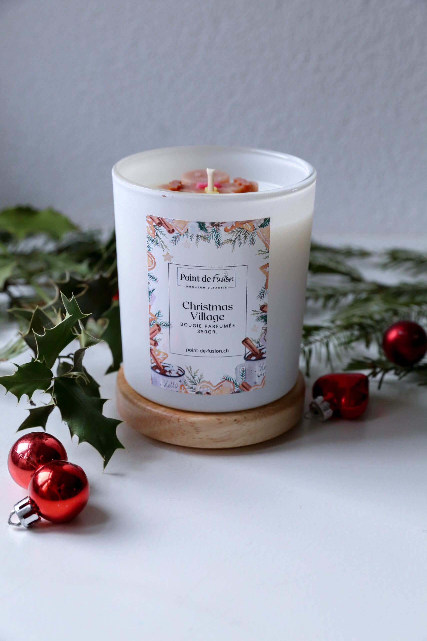 Bougie de Noël Christmas Village, une interprétation originale de l’ambre, lumineuse, dramatique. Elle mélange la douceur du pralin, de la vanille et du benjoin avec des épices chaudes et de la rose. Une composition séduisante qui perdure.