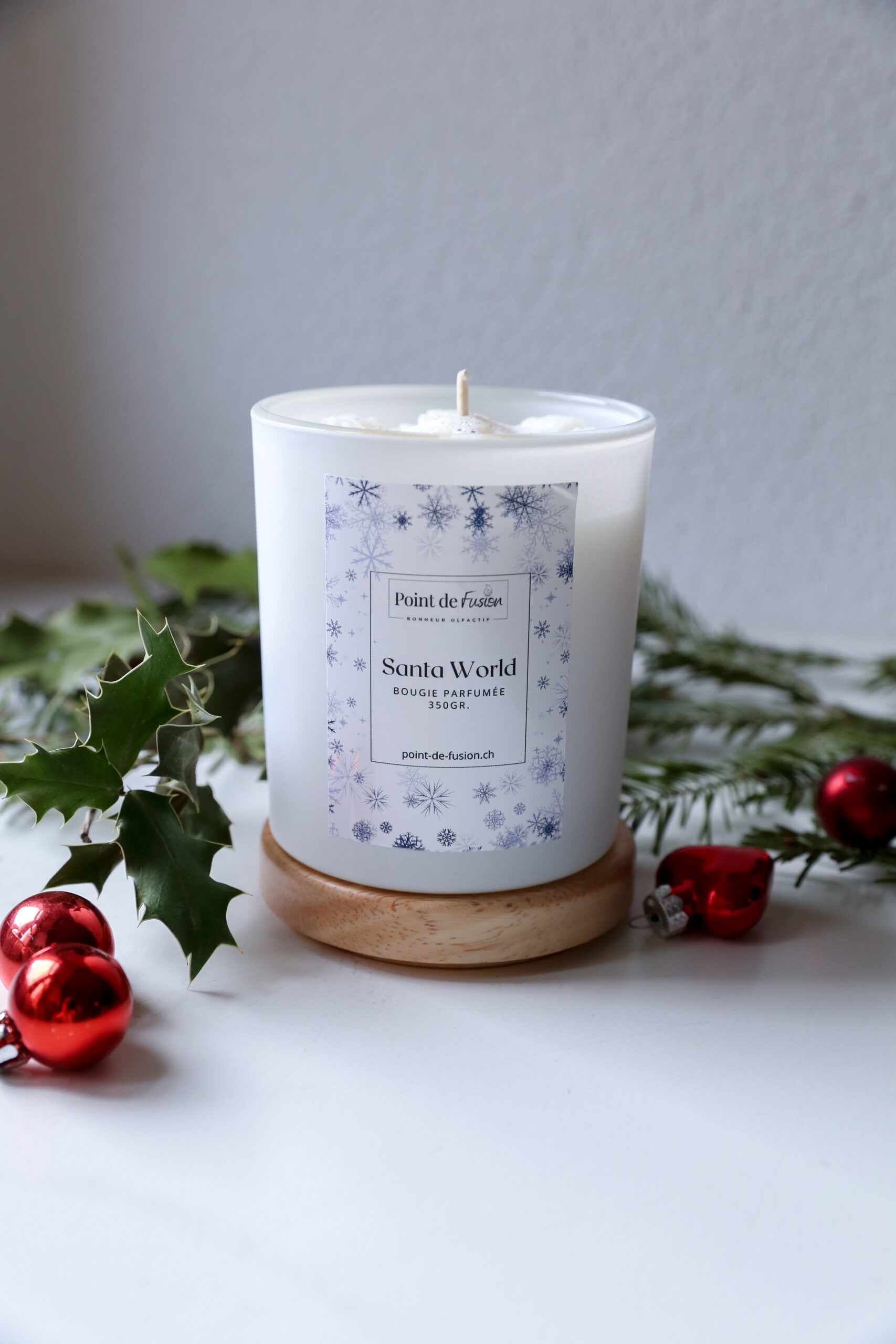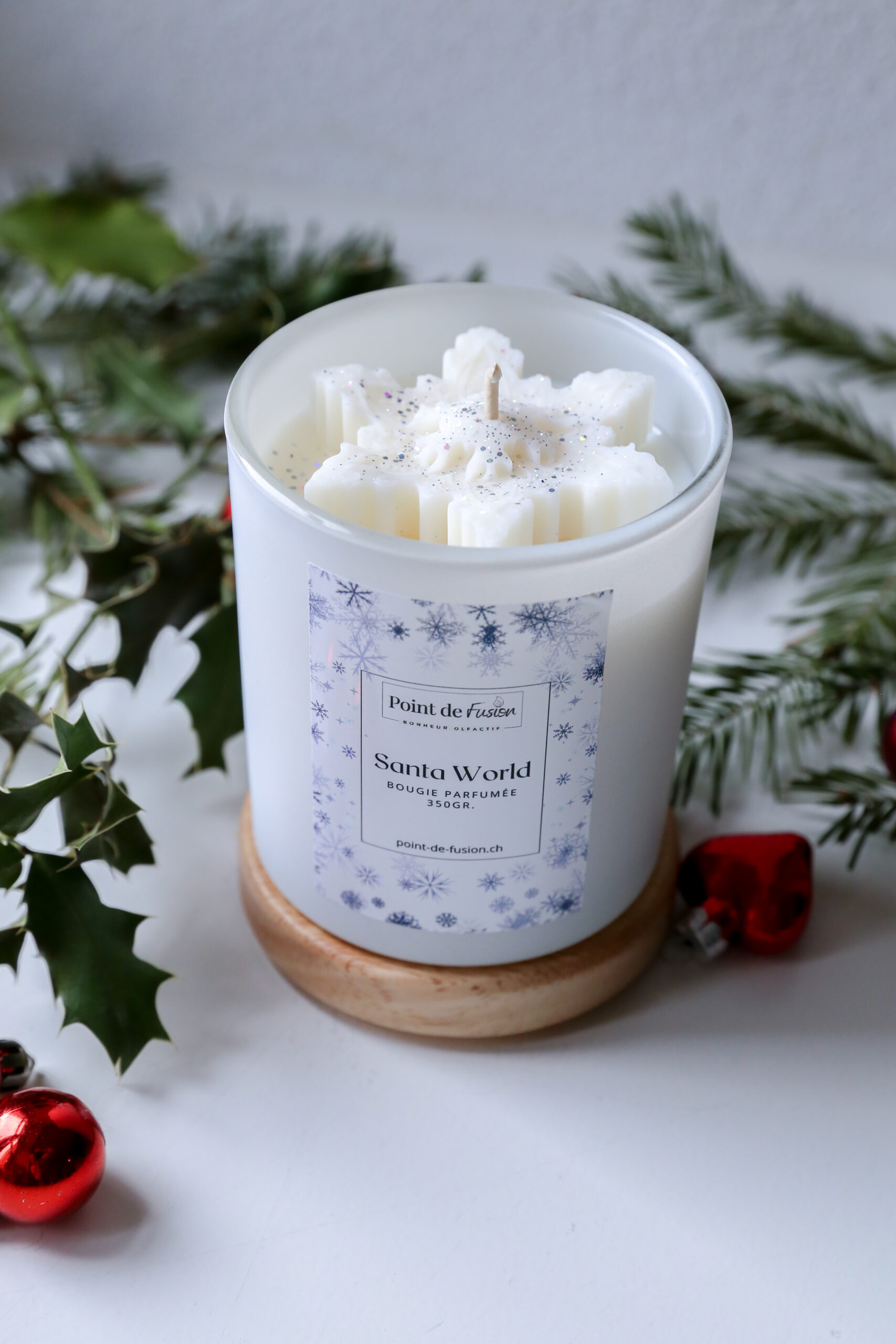 Bougie de Noël Santa World, la chaleur de la cannelle se mêle à la fève tonka, avec un accent de basilic qui surprend. La douceur de la vanille caresse des notes de bois de cèdre et de patchouli.