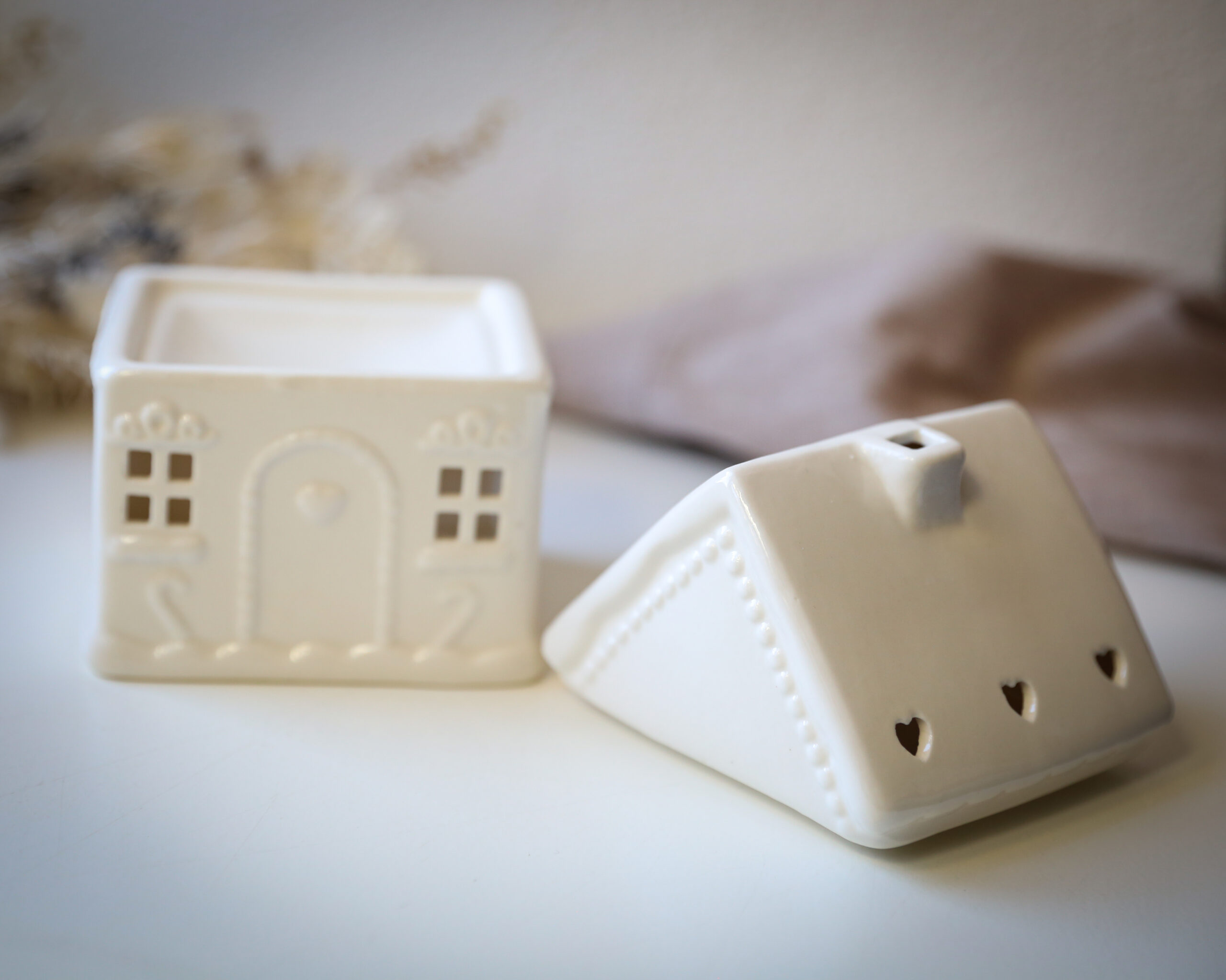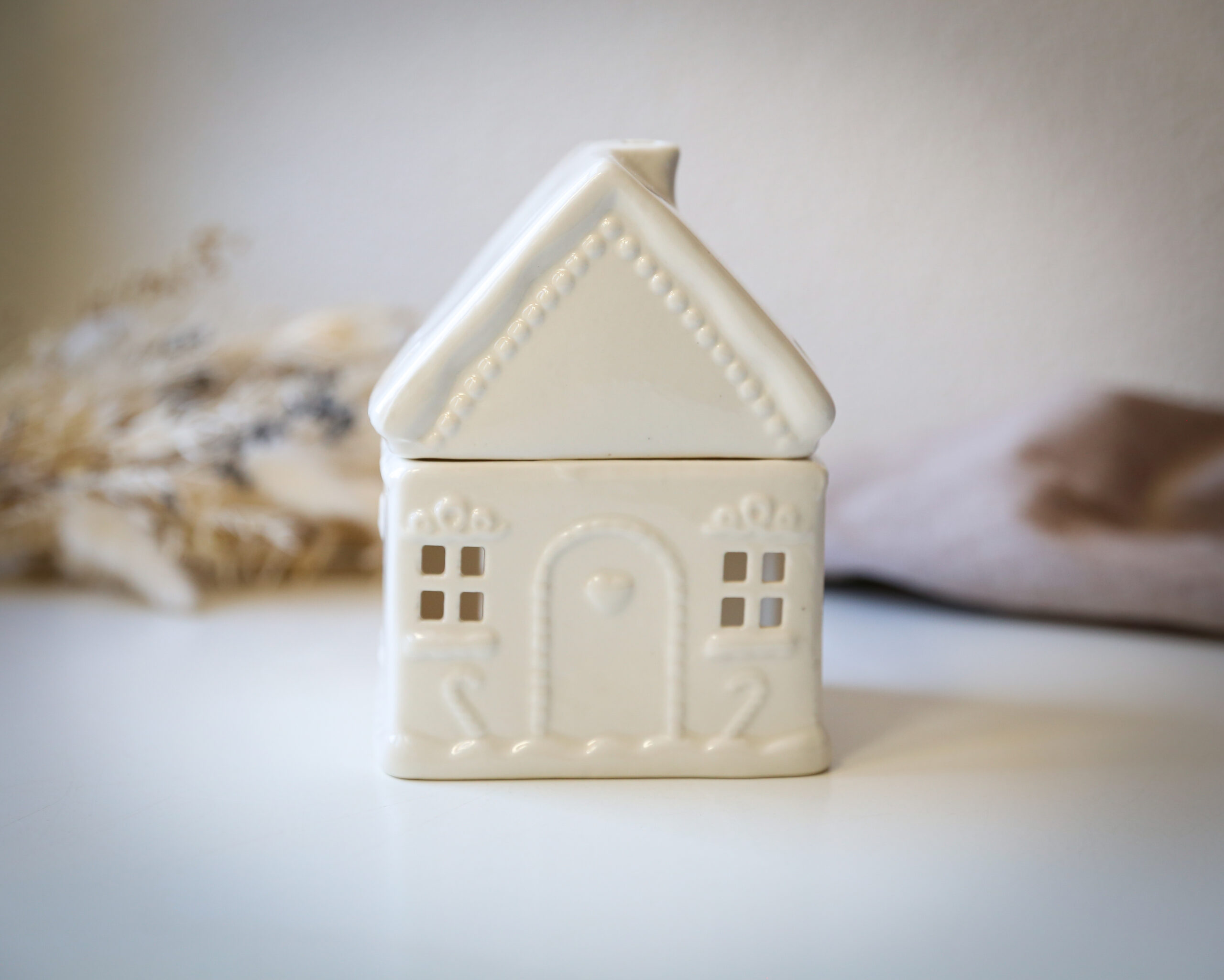 Un brûleur à mazout à couvercle en forme de maison en pain d’épice blanc. Parfait pour créer une ambiance festive à Noël avec un parfum douillet et une douce lueur de bougie. Retirez le couvercle en cours d’utilisation.