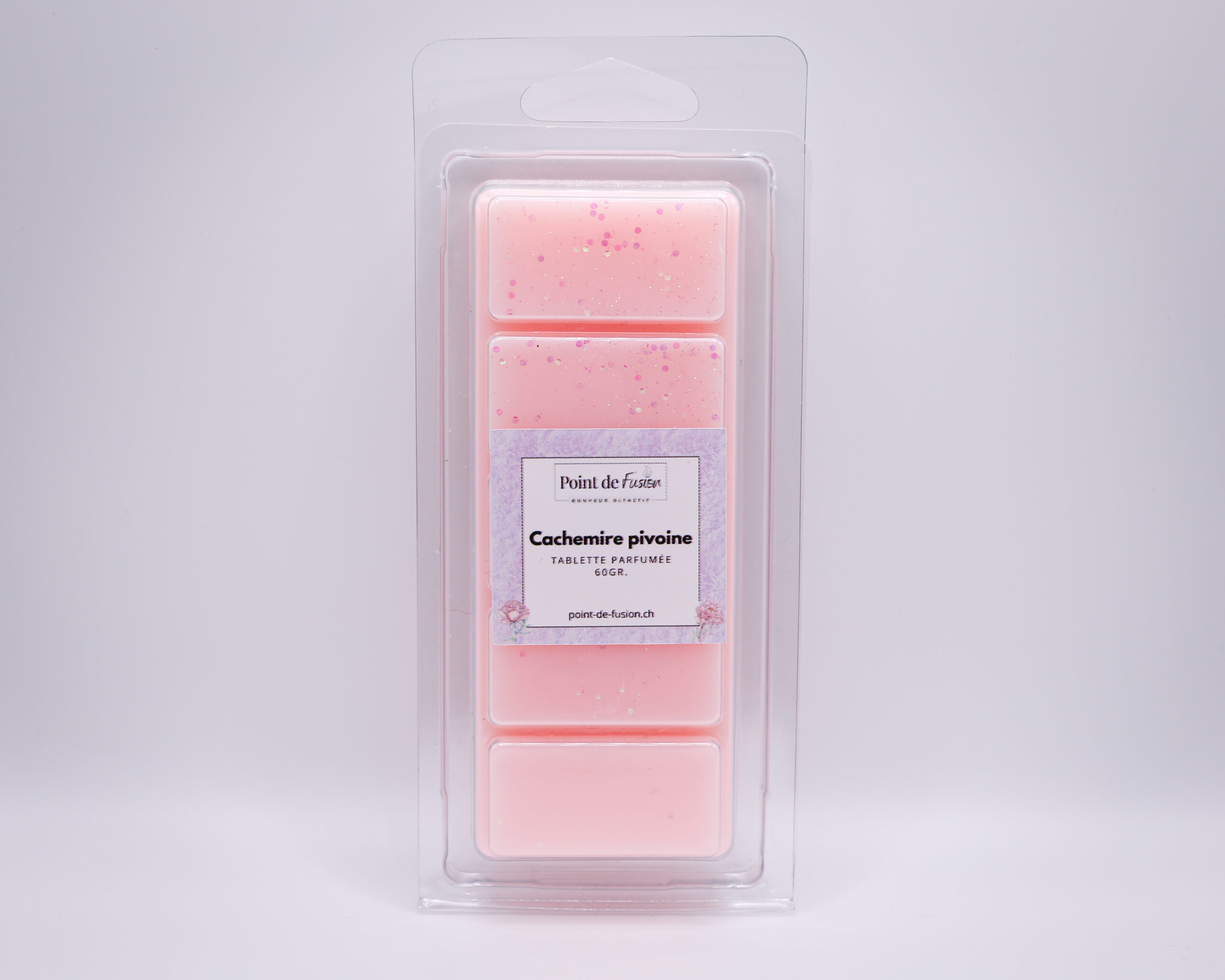 Tablette parfumée Cachemire pivoine. Une élégante composition de pivoines et baies rouges, de bois sombres et de baumes enveloppée de daim et de cachemire. Sur un coeur praliné et de feuilles de thé. Amour toujours sur un drap de velours.